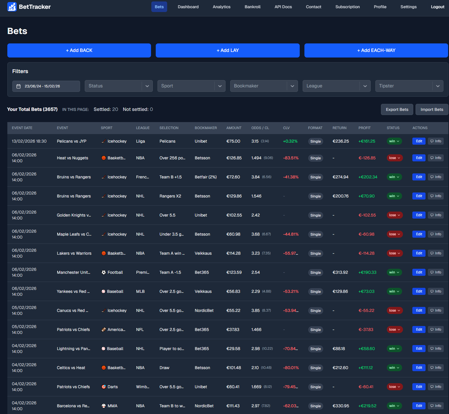 Quickly log singles, accumulators, lay bets, and each-way bets, and import your old bets using CSV or API