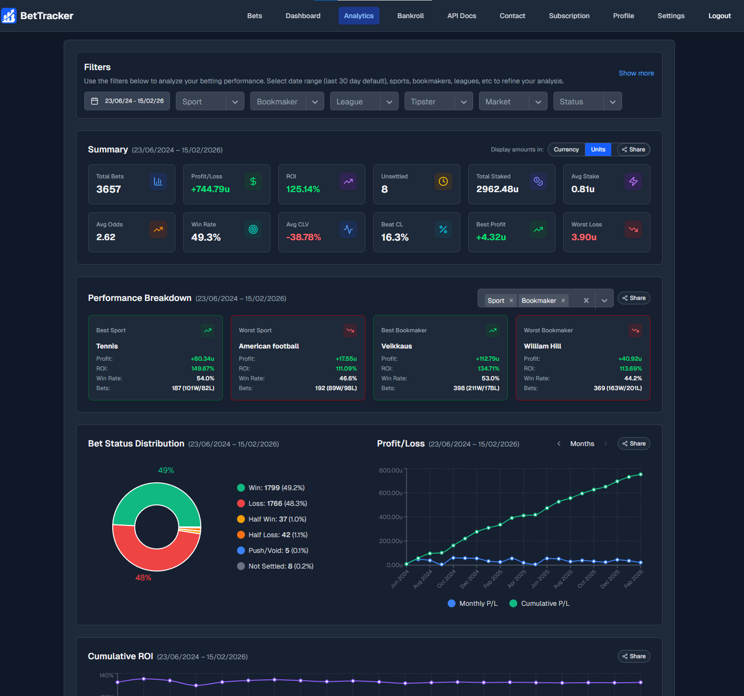 Track ROI, profit/loss, win rates, and more across your betting history