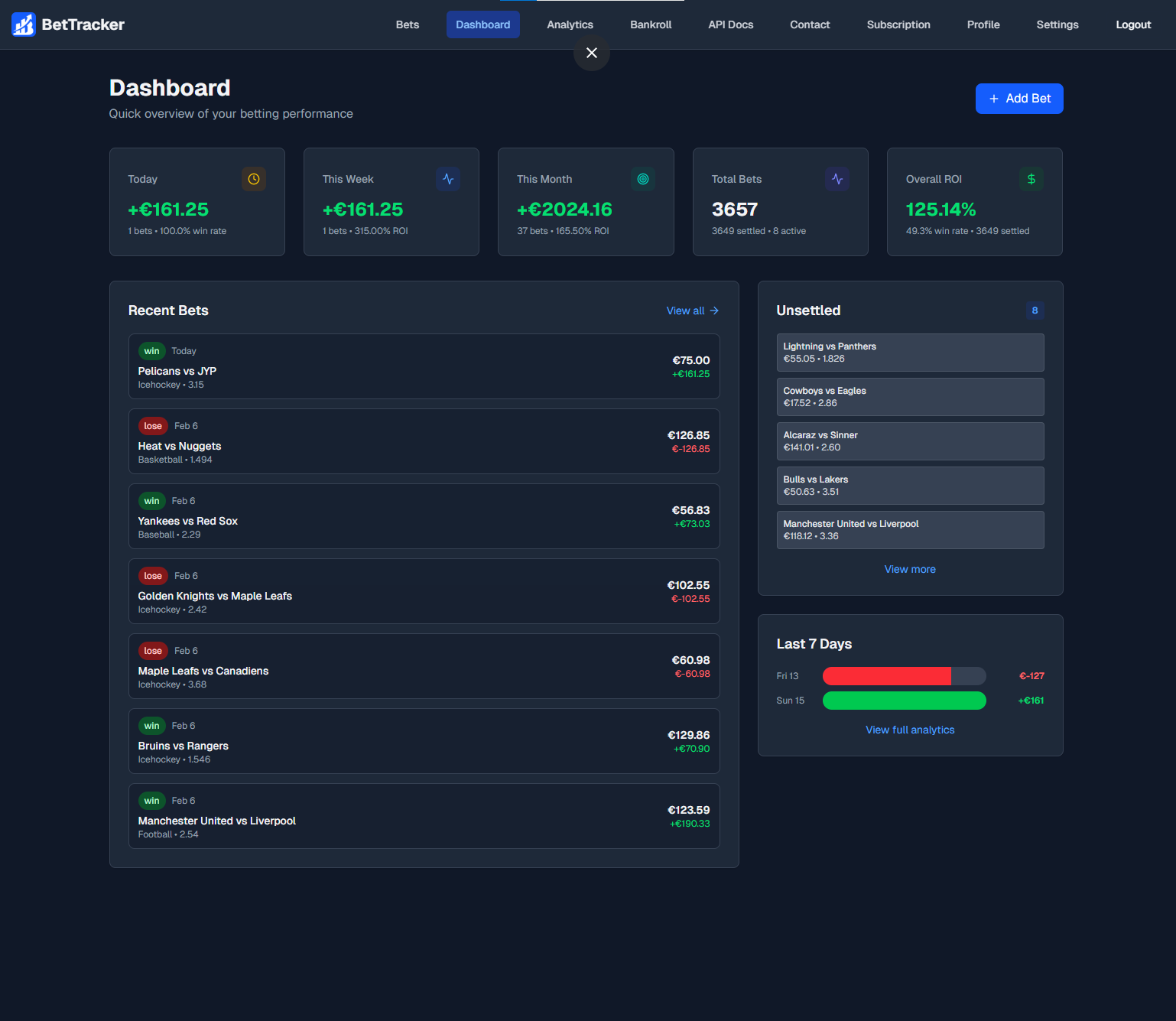 Track ROI, profit/loss, win rates, and more across your betting history